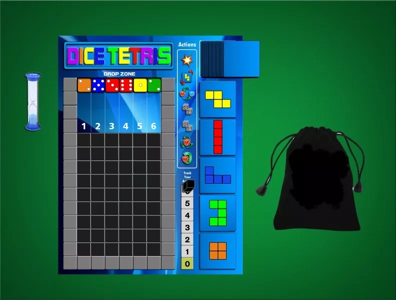 Inspirado no videogame TETRIS, exceto que você joga esta versão com o uso de dados. A cada turno, você rola 6 dados coloridos e os coloca na zona de queda. Em vez de fazer com que as formas caiam, você tentará fazer com que os dados caiam e criem as formas. Existem cinco dados coloridos que serão usados para combinar todas as formas coloridas semelhantes.