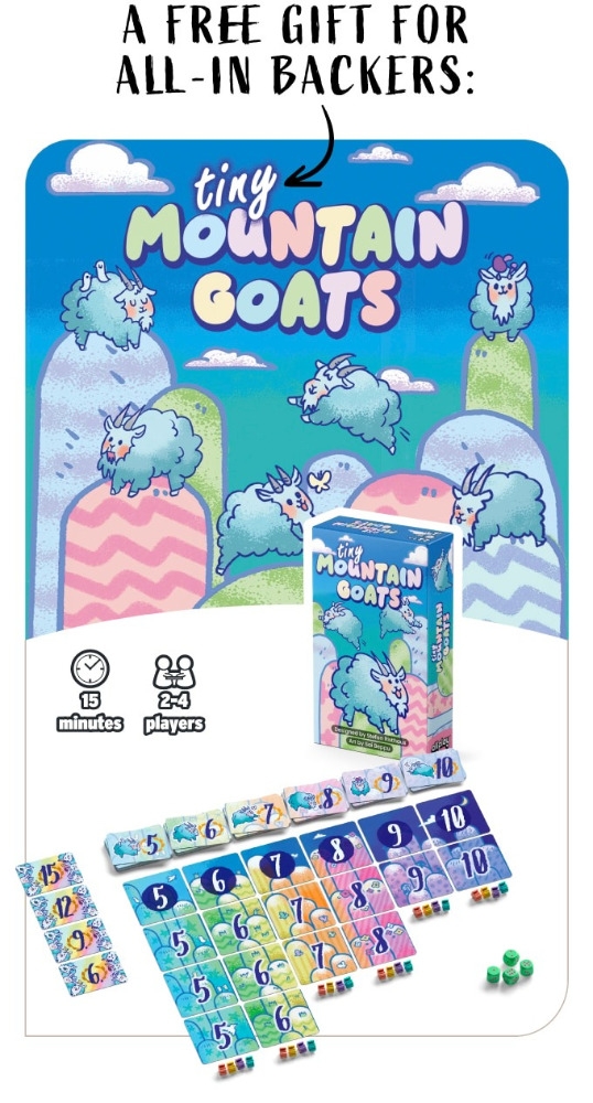 Caixa e componentes da versão Tiny Mountain Goats (Allplay, 2026), de tamanho reduzido, disponível no Kickstarter de Mountain Goats Legacy
