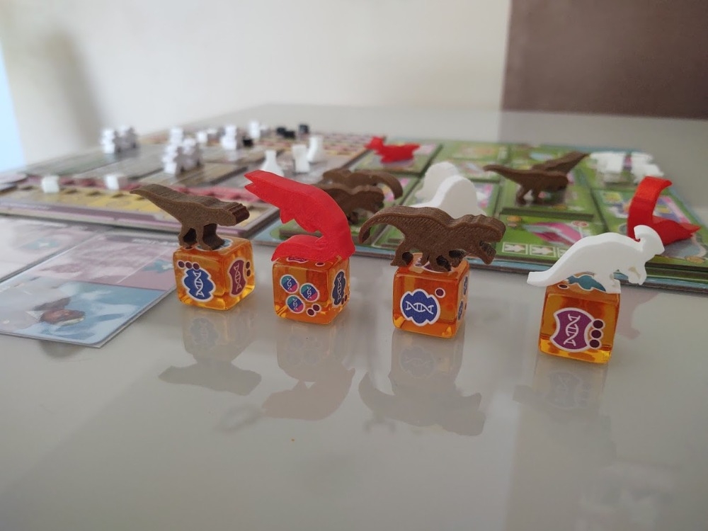 Jogando Ilha dos Dinossauros com meeples dos dinos terrestres e marinhos