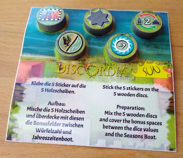 Você embaralha os discos de madeira virados para baixo antes de cada jogo e os usa para cobrir os símbolos de bônus no tabuleiro do jogo (entre o número do dado e o barco da temporada).