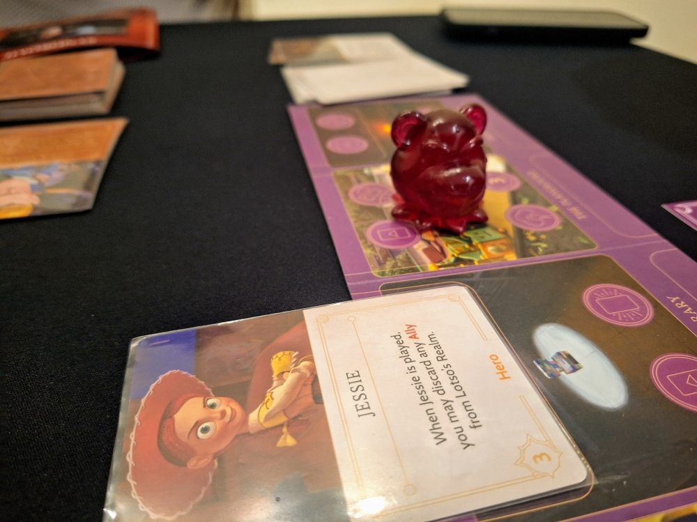 Uma das ações permite que você escolha outro jogador, compre duas cartas do baralho do destino daquele jogador e jogue uma delas no tabuleiro dele, cobrindo dois dos quatro espaços de ação em um dos locais daquele jogador. O deck do destino contém heróis, itens e efeitos, essas cartas permitem que outros jogadores atrapalhem um vilão em particular.