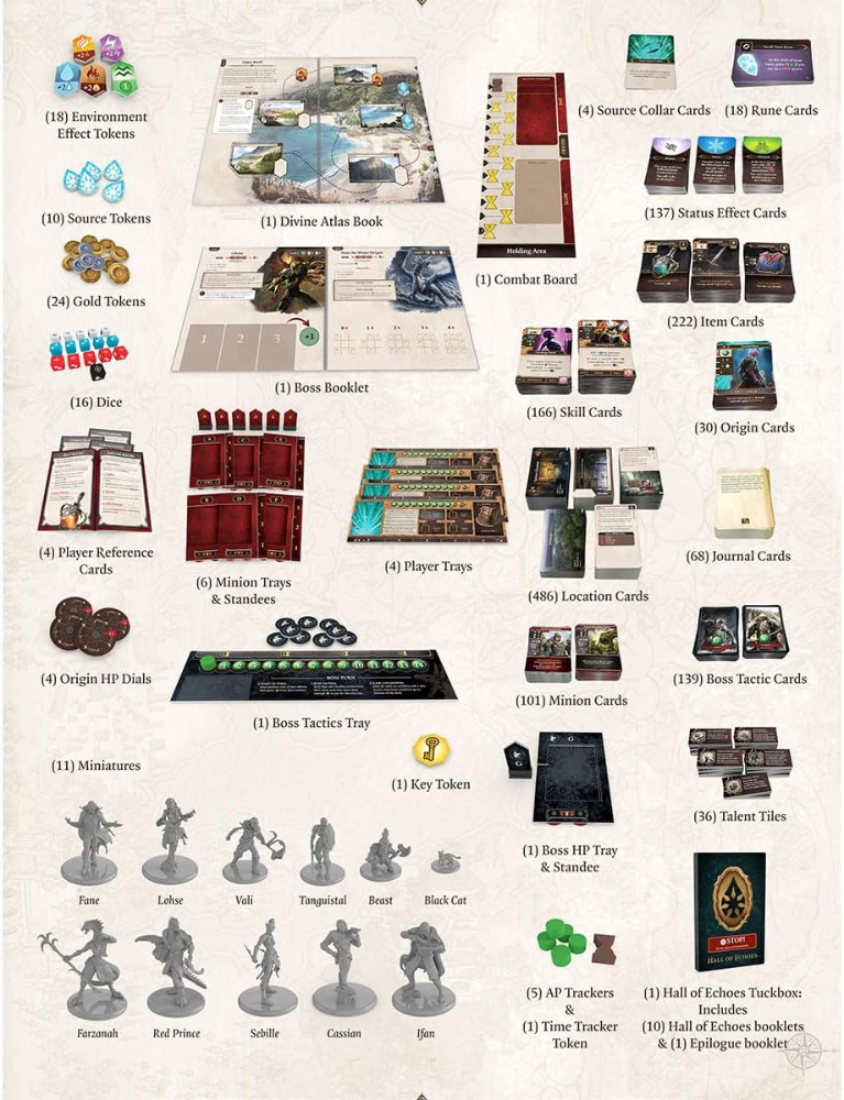 1 livro de história, 1391 cartões (todos 63x88mm), 37 miniaturas, 342 fichas, 16 dados, 2 sacos de pano.
