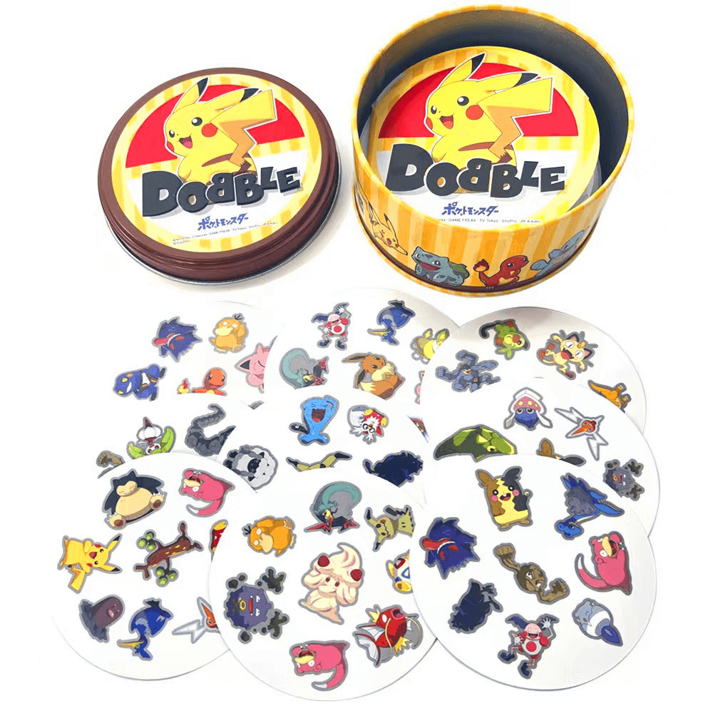 "Dobble Pokémon" é um jogo jogado com 55 cartas com 8 Pokémon desenhados nelas.