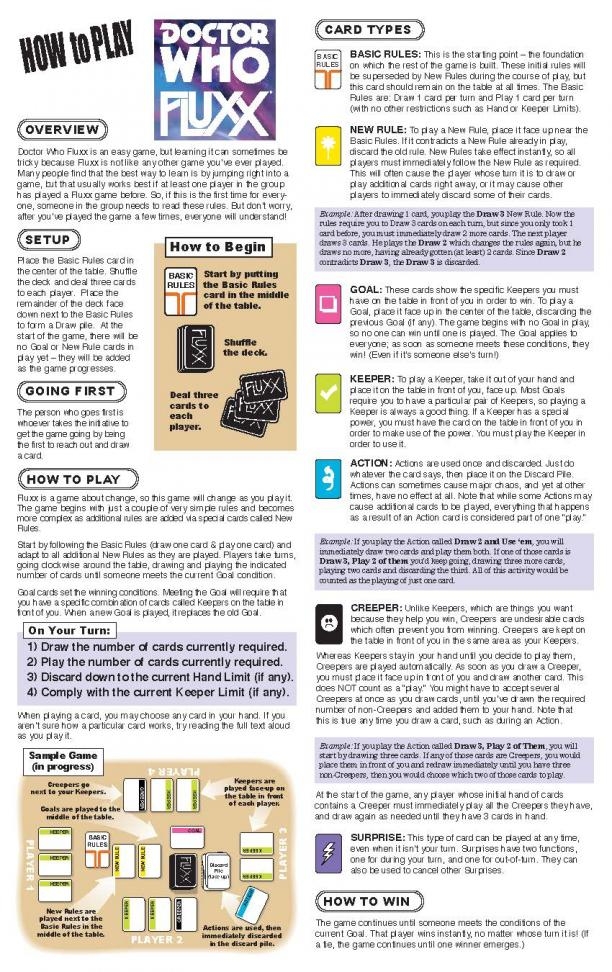 Doctor Who Fluxx leva a jogabilidade básica do Fluxx e combina com várias regenerações do Doctor Who, vários companheiros, tecnologia Gallifreyan, K-9, Cybermen, Daleks, Weeping Angels e o Mestre.