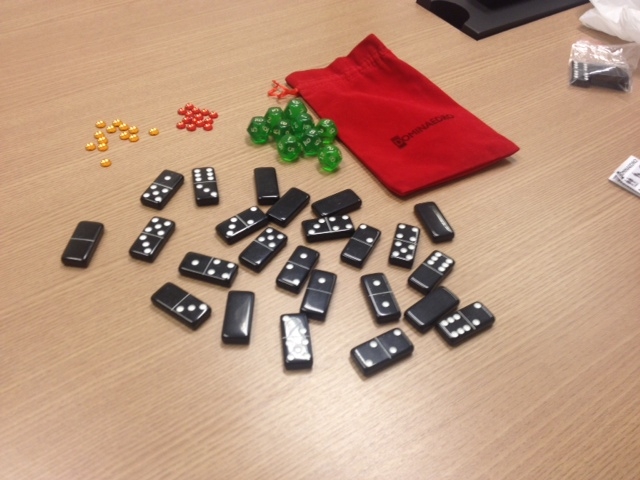 Dominaedro é um jogo abstrato jogado com 9 dados d12 , peças de dominó e alguns contadores.