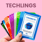 A expansão Techlings, com 18 cartas, introduz traços de anexos para um jogo avançado.