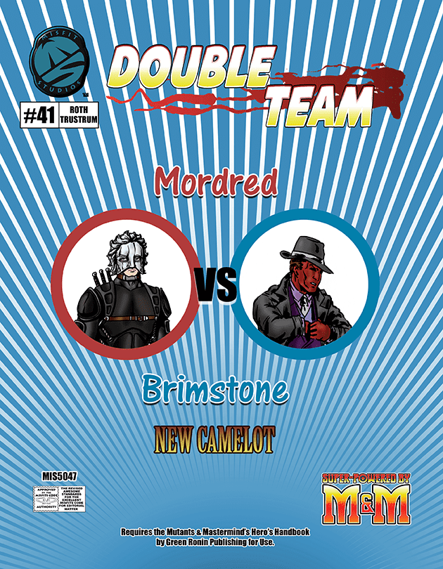 Double Team: Mordred VS Brimstone fornece dois personagens para seus jogos Super-Powered by M&M: um vilão, Mordred, e um herói, o meio-demônio, Brimstone. Mordred faz parte da nossa minissérie New Camelot.
