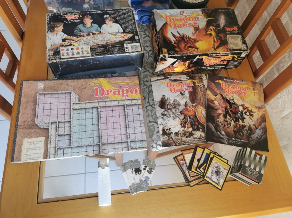 Caixa danificada; 172 cartas coloridas com monstros, armadilhas, magias, tezouros, etc; 1 escudo com resumo de regras e outro escudo com resumo de aventura; Trocentos stands de personagens e inimigos.