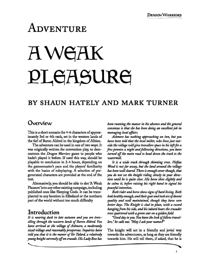 Este é um cenário curto para 4-6 personagens de aproximadamente 3º ou 4º rank, ambientado nas terras ocidentais do feudo do Barão Aldred, no reino de Albion.