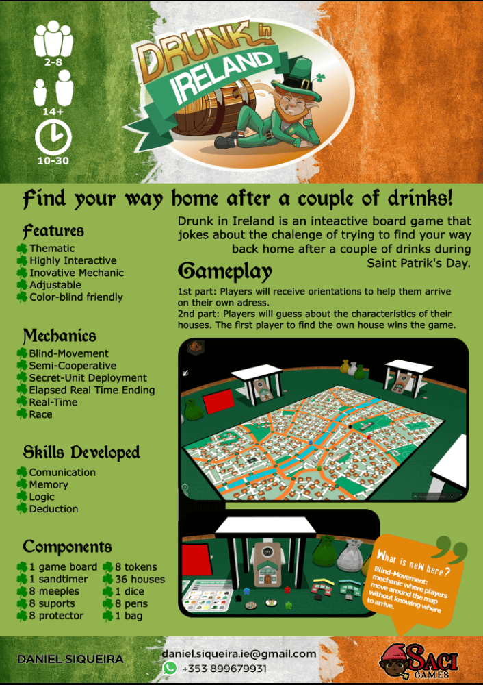 Drunk in Ireland é um jogo em tempo real que pode ser jogado em dois modos: sequencial ou simultâneo. O jogo possui uma mecânica de movimentação às cegas, na qual cada jogador se deslocará pelo mapa de acordo com as orientações recebidas, sem ter qualquer ideia de seu destino final. Para isso, cada jogador será guiado por um outro jogador que fará o papel da sua consciência.
