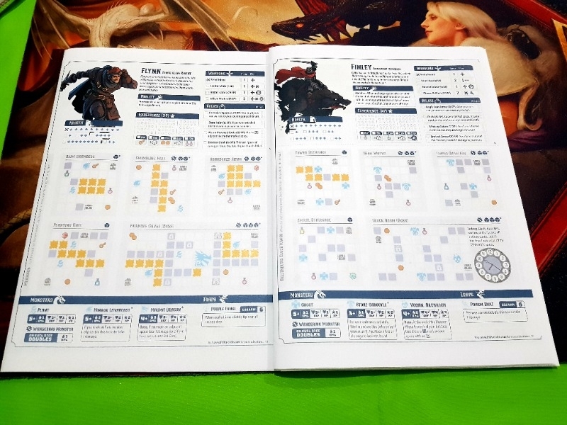 Cada seção de personagem apresenta um personagem e sua habilidade e acompanha sua saúde e progresso. Cada seção de masmorra mostra quatro masmorras menores e uma masmorra de chefe, e descreve os monstros e armadilhas encontradas dentro.
