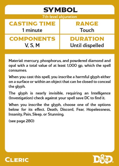 Os cards possuem todas as informações necessárias: tempo de conjuração, alcance, componentes, duração e descrição completa* de cada magia. Em alguns casos a descrição completa não é incluída por questão de espaço. Nestes casos é informada a página de referência do Livro do Jogador.