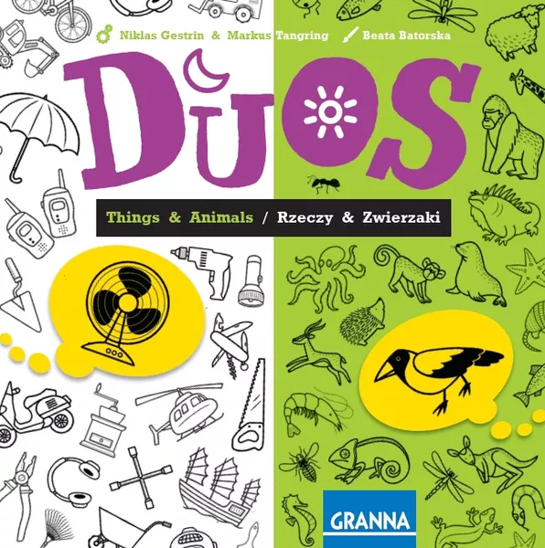Em DUOS, disponível em edições que apresentam coisas e animais ou esportes e contos de fadas, você recebe doze cartas em uma das categorias e é desafiado a criar quatro pares de oito dessas cartas. Se outros jogadores fizerem os mesmos pares que você, eles pontuam! Cada categoria inclui mais de cem imagens.