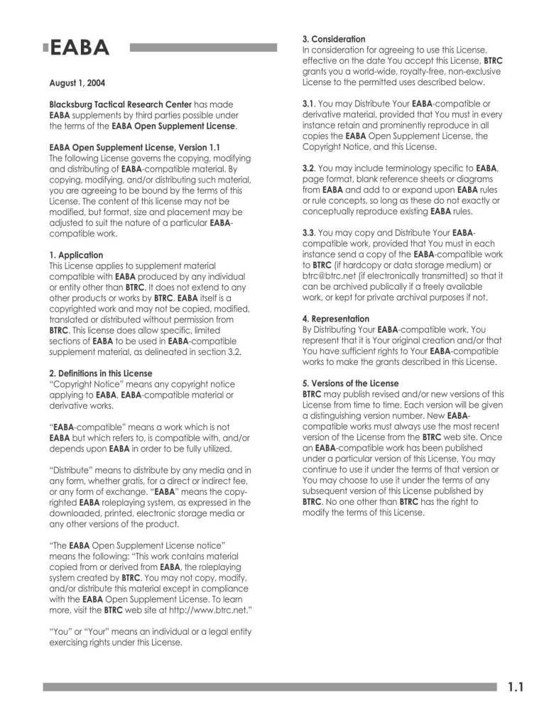 Licença EABA Open Supplement, Versão 1.1 - A licença a seguir rege a cópia, modificação e distribuição de material compatível com EABA.