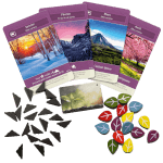 Uma cópia dos componentes de madeira e cartas incluídas nas cópias enviadas aos apoiadores do Kickstarter (e vendidas depois).