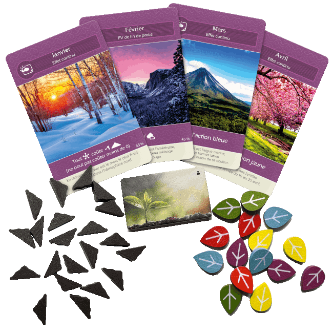 Inclui uma ficha de jogador ativo de madeira, 25 fichas de folha de madeira, 75 fichas de solo de madeira e um pacote de calendário de 12 cartas que adiciona 24 modificadores de jogo (as cartas são duplas).