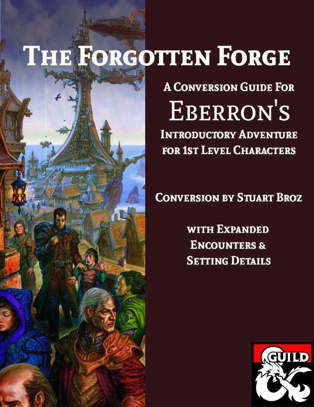 A Forgotten Forge é a aventura clássica mais frequentemente recomendada como introdução a Eberron. Uma aventura destinada ao personagem de 1º nível, The Forgotten Forge se passa em Sharn e está incluída no cenário de campanha de Eberron. Este documento é uma atualização que permitirá que você o use com Dungeons & Dragons (5ª Edição). Além disso, notas foram adicionadas para fornecer contexto, encontros e ganchos de aventura adicionais para que o Mestre possa apresentar alguns de seus aspectos favoritos de Eberron. Devido a essas notas, este guia tem várias páginas a mais do que a aventura na qual se baseia.