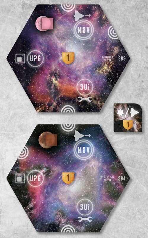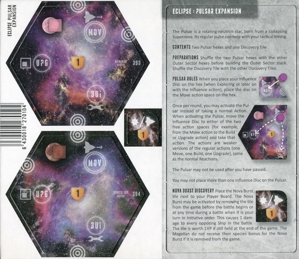 A expansão contém dois hexágonos de setor Pulsar e uma Nova Ficha de Descoberta.