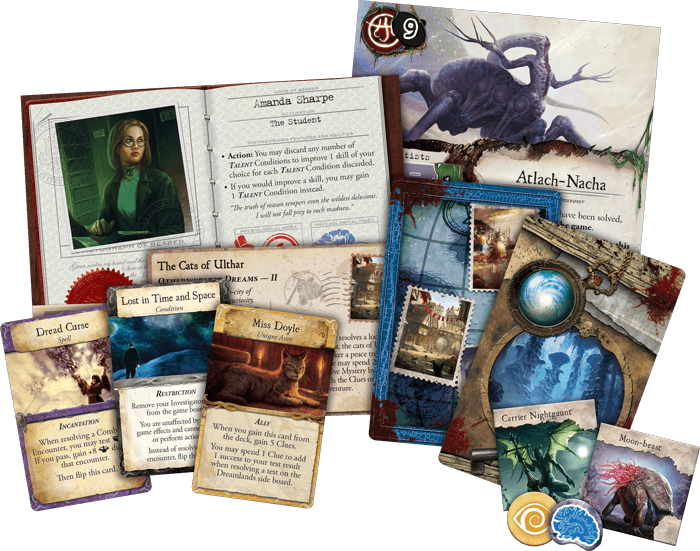 130 Cartas de Encontro (4 genéricos, 4 América, 4 Europa, 4 Ásia/Austrália, 6 de outro mundo, 16 Cartas "Dreamlands", 20 Cartas "DreamQuest" 48 de pesquisa, 24 de encontros especiais);