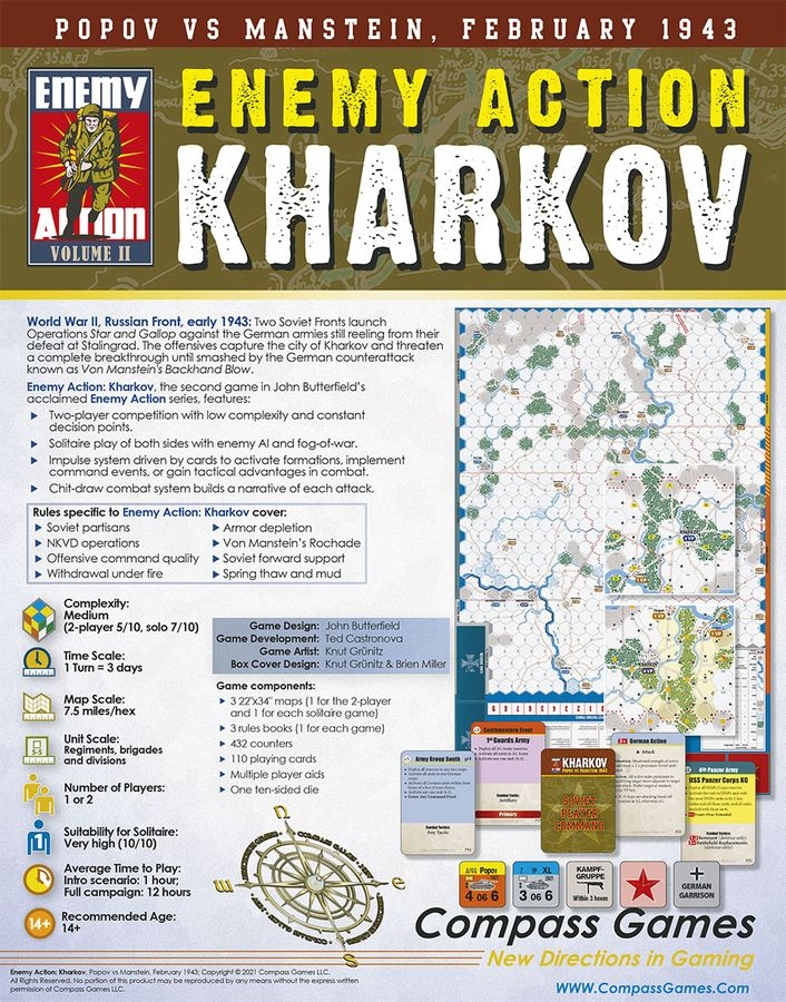 Enemy Action: Kharkov é o segundo jogo da aclamada série Enemy Action de John Butterfield de jogos dirigidos por cartas que simulam batalhas cruciais na Segunda Guerra Mundial, jogável por dois jogadores ou um jogador controlando qualquer um dos lados do conflito.