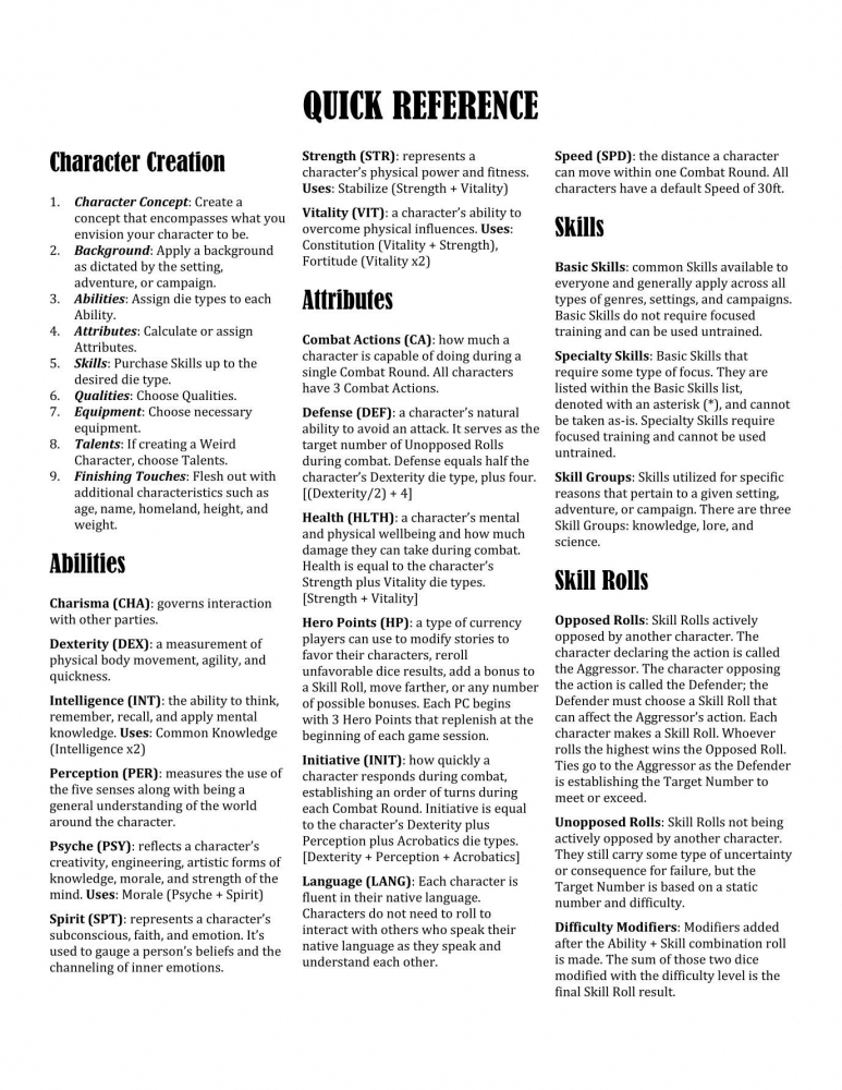 Uma "referência rápida" às regras básicas do jogo; o documento é insuficiente para aprender a jogar e deve ser usado como uma referência durante o jogo normal.