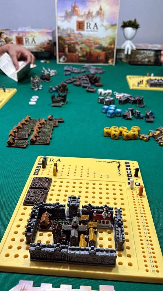 Era: Medieval Age é o sucessor espiritual para Roll Through The Ages. Enquanto Roll Through The Ages foi pioneiro em jogos estilo roll-and-write, a Era é pioneiro no roll-and-build!