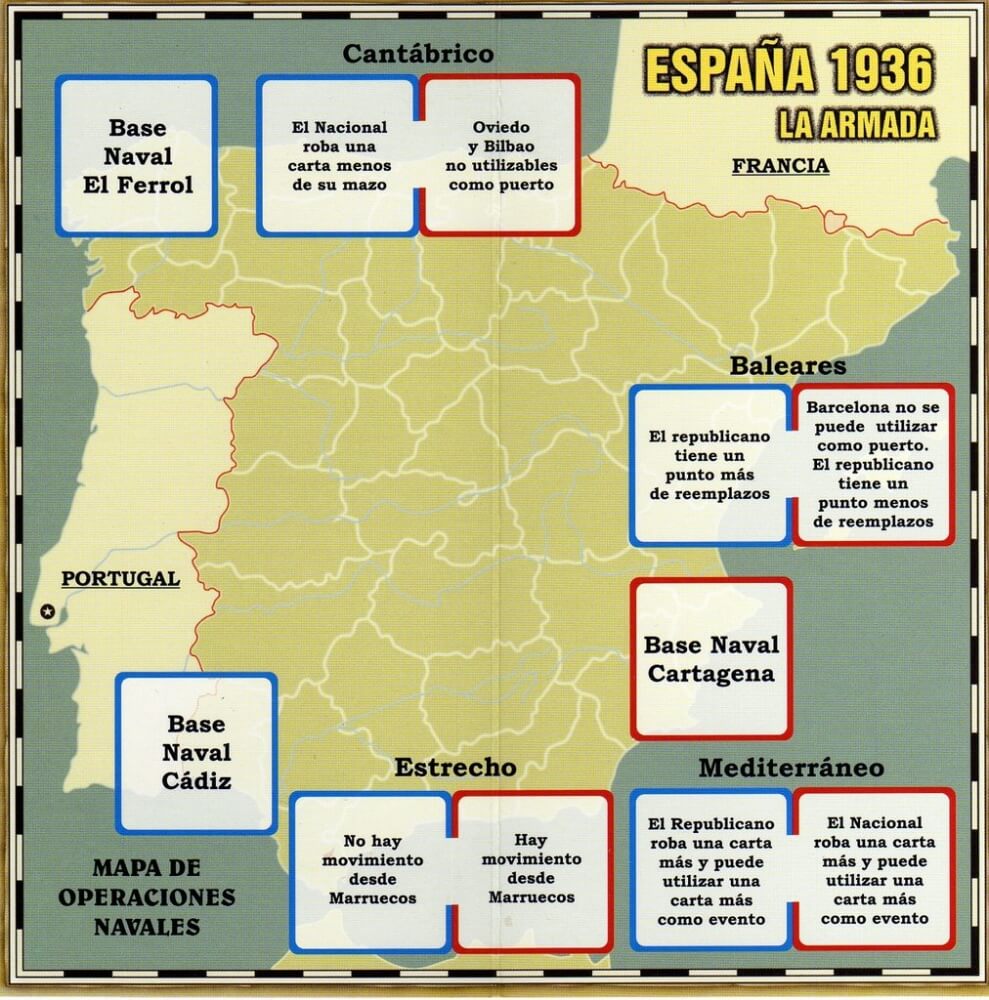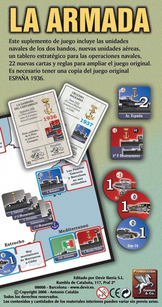 España 1936 - La Armada é um módulo de expansão para o jogo original España 1936. Este suplemento inclui jogos de unidades navais de ambos os lados, um tabuleiro estratégico para as operações navais, 24 cartas e um novo conjunto de regras para expandir o jogo em sua edição original espanhola.