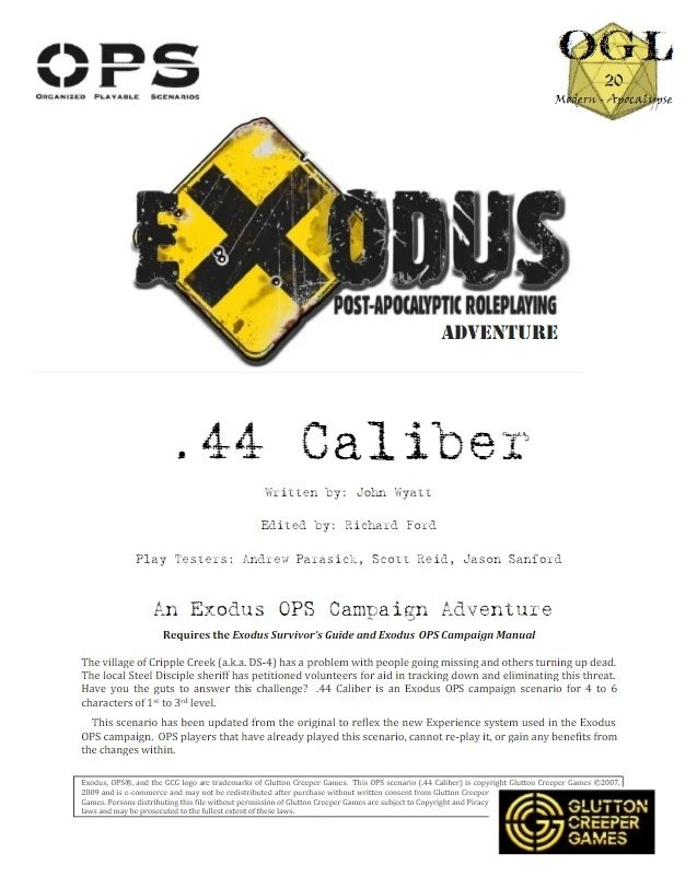 A vila de Cripple Creek (também conhecida como DS-4) tem problemas com pessoas desaparecidas e outras aparecendo mortas. O xerife local Steel Disciple solicitou ajuda a voluntários para rastrear e eliminar esta ameaça. Você tem coragem de responder a esse desafio? .44 Calibre é um cenário de campanha Exodus OPS para 4 a 6 personagens de 1º a 3º nível e pode ser facilmente adaptado a qualquer cenário pós-apocalíptico.