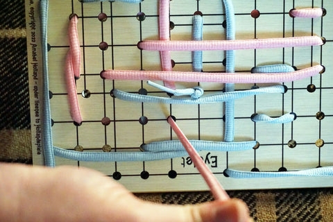 Este é um joguinho simples, estranho e alegre que leva apenas um minuto para aprender. Há algo de reconfortante no som do cadarço deslizando contra a tábua enquanto você o puxa. E há algo delicadamente estressante à medida que os buracos ficam cada vez menos e os cadarços começam a ficar cada vez mais curtos. Cada partida resulta em um cruzamento único e visualmente atraente de cadarços azuis e rosa. Cada renda tem um nó cuidadosamente amarrado em uma extremidade à mão – pela designer Amabel Holland, pela editora Mary Holland ou por um de nossos amigos.