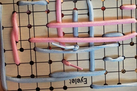 Eyelet é um jogo de rolar e mover para dois jogadores em que os cadarços são enfiados nos orifícios de uma placa de corte personalizado. Qualquer cadarço pode ser movido por qualquer jogador, mas deve ser movido o número exato de espaços rolados e, em seguida, enfiado em um buraco vazio. Quando você não consegue completar seu turno, você perde. E assim, o objetivo é manobrar os cadarços para limitar as opções do seu oponente - mas se eles escaparem, eles podem simplesmente devolver sua armadilha astuta para você.
