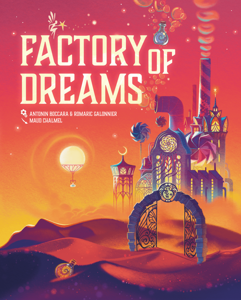 Factory of Dreams é um jogo cooperativo. Em cada jogo, vocês devem trabalhar juntos para criar 5 sonhos baseados no tema daquela noite. Você adicionará cartões de Pensamento – cada um com uma única palavra – às 5 peças de Frasco para criar associações que se ajustem a esse tema. Você também pode usar as fichas de Ferramentas para ajudá-lo – mas suas habilidades especiais só podem ser usadas uma vez, então use-as com sabedoria! Você então pegará seu tabuleiro de Sonho e, para cada frasco, escreverá secretamente 1 sonho (como uma única palavra ou ideia) que se encaixe no tema e conecte as cartas de Pensamento naquele frasco. Você ganha pontos por inventar sonhos que correspondam aos criados pelos outros jogadores.
