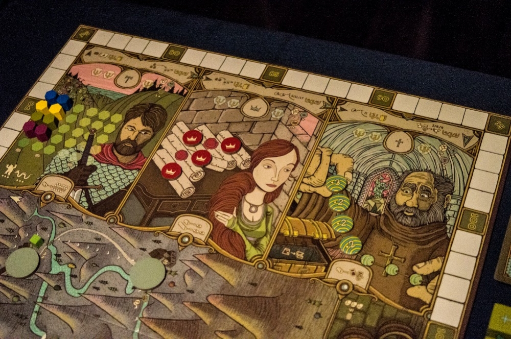 Detalhe do tabuleiro após a preparação: Guilda do Cavaleiro, Guilda do Nobre e Guilda do Monge.