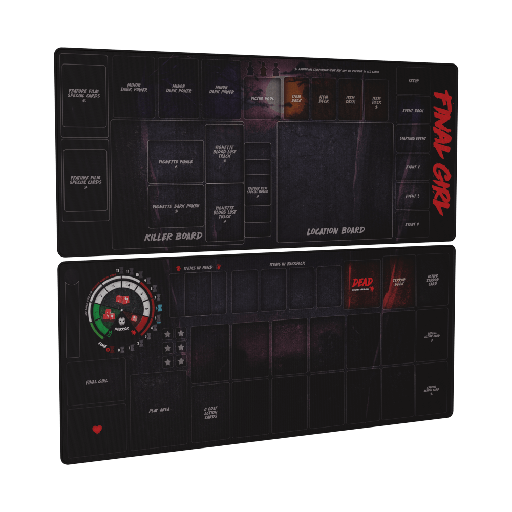 Consiste em uma versão melhorada do Final Girl: Game Mat (Series 1), apresentando espaços não apenas para as expansões de caixa grande das temporadas 1 e 2, como também para as mini-expansões. É o playmat definitivo par Final Girl.