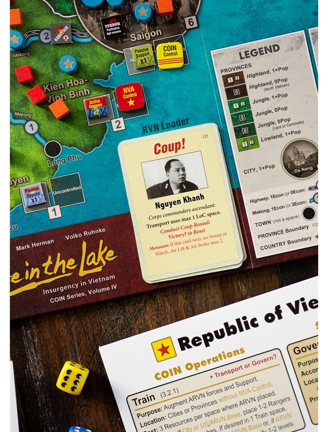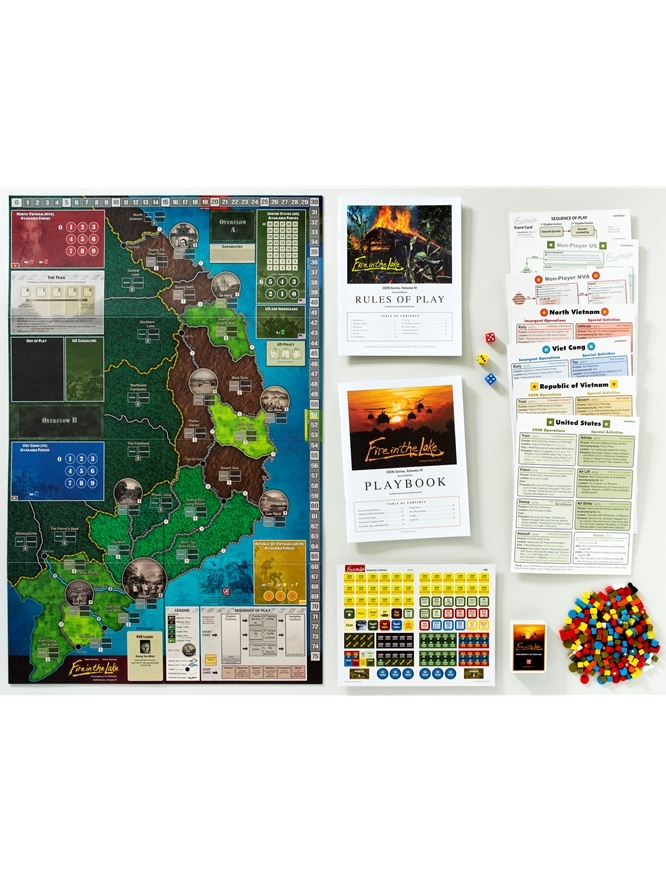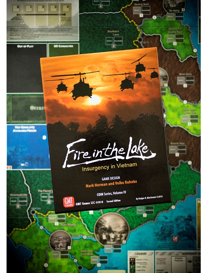 Volume IV da série da GMT COIN, este jogo mergulha de cabeça na batalha importante e complexa para o Vietnã do Sul. Um tratamento único de multi-facção da Guerra do Vietnã, Fire in the Lake terá 1 a 4 jogadores em varreduras helitransportadas americanas na selva e infiltração comunista do Sul, e em conferências inter-aliados, política Saigon, interdição do Ho Chi Minh Trail, de defesa aérea de infra-estrutura do Norte, escala graduada, e guerra da mídia.