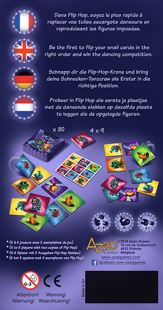 Em Flip Hop, cada jogador recebe um conjunto de nove tiles de dupla face com diferentes caracóis nelas. Um baralho de cartas de missão é embaralhado e colocado de face para baixo no centro da mesa. Um jogador vira a carta de cima, que retrata uma missão de 9 tiles em linhas 3x3. O primeiro jogador a organizar seus 9 tiles reivindica a carta e revela a próxima carta.