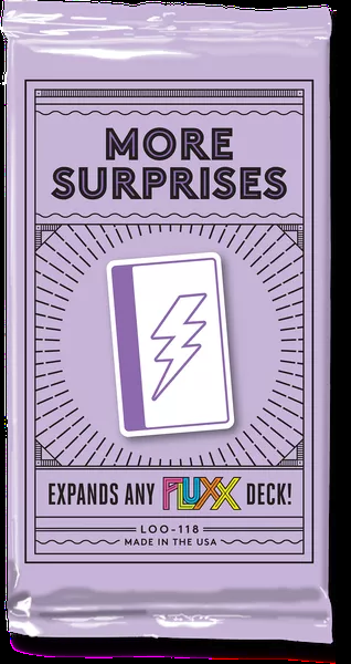 More Surprises é um pacote de expansão para qualquer jogo Fluxx autônomo, com este pacote contendo as quatro cartas surpresa originais, quatro cartas surpresa mais raras e duas novas surpresas.
