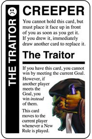 Ele diz: "Se você tiver este cartão, você não pode ganhar atendendo ao objetivo atual. No entanto, se outro jogador atende ao Objetivo, você ganha em vez dele. Este cartão se move para o jogador atual sempre que uma Nova Regra é jogada".