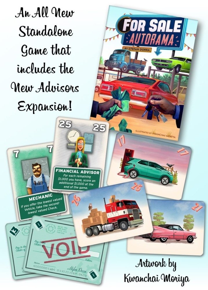 For Sale Autorama é um jogo standalone que reimplementa o For Sale original já incluindo a nova expansão Advisors.