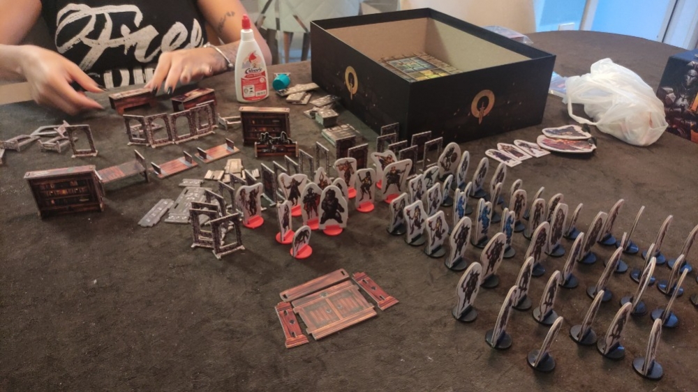 5 punchboards com miniaturas de papel de personagens, mobília, portas, tokens e outros elementos de cenário;