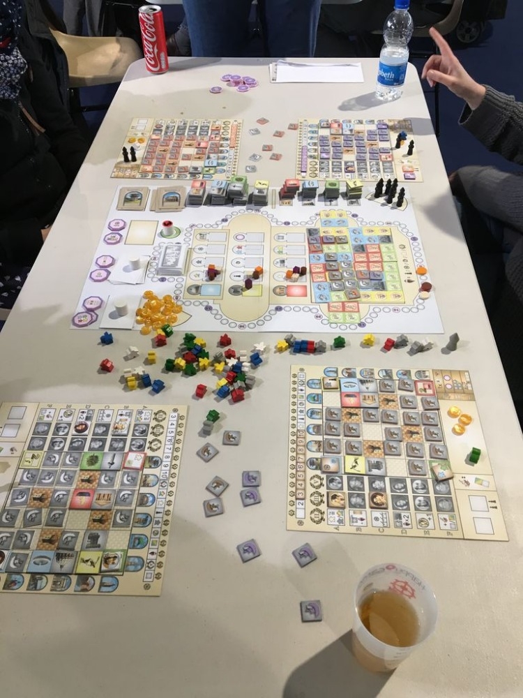 Jogo em andamento protótipo Stefan Feld Forum Trajanum