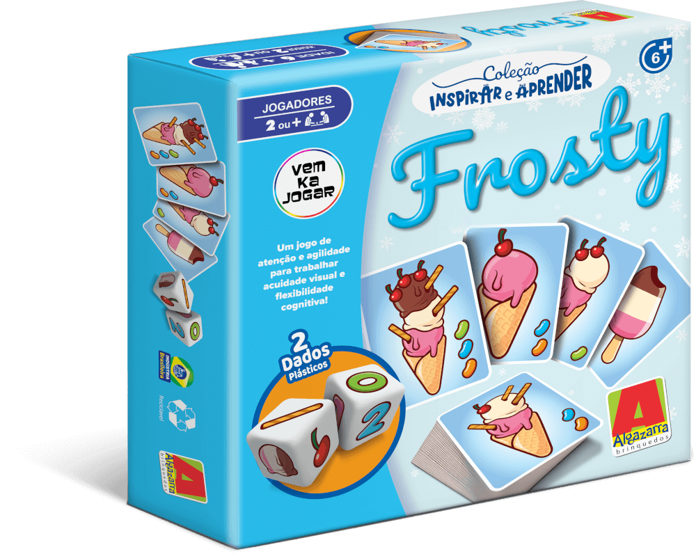 Frosty da Coleção Inspirar e Aprender é um jogo de atenção e agilidade, indicado para crianças a partir de 6 anos, que trabalha a acuidade visual e a flexibilidade cognitiva através do raciocínio lógico-matemático.
