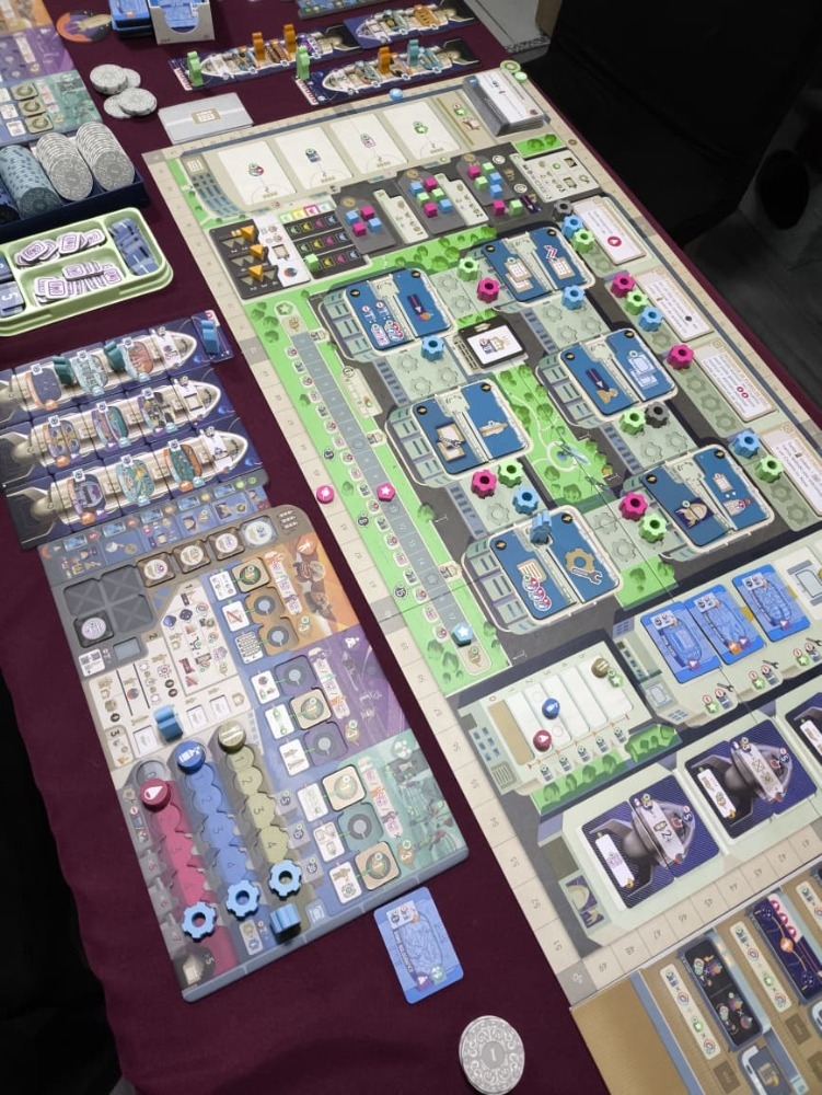 Por sua vez, você colocará um trabalhador para realizar duas ações na rede em constante expansão, lançará um ônibus espacial e enviará um de seus trabalhadores ao espaço como piloto, ou convocará todos os seus trabalhadores terrestres para coletar bônus de financiamento. As ações incluem a aquisição de projetos, a construção de naves, a atração de visitantes e a construção de conexões entre locais que aumentam a seleção de ações ao longo do jogo. Você também afetará os mercados de recursos que fluem e refluem com as ações de todos os jogadores.
