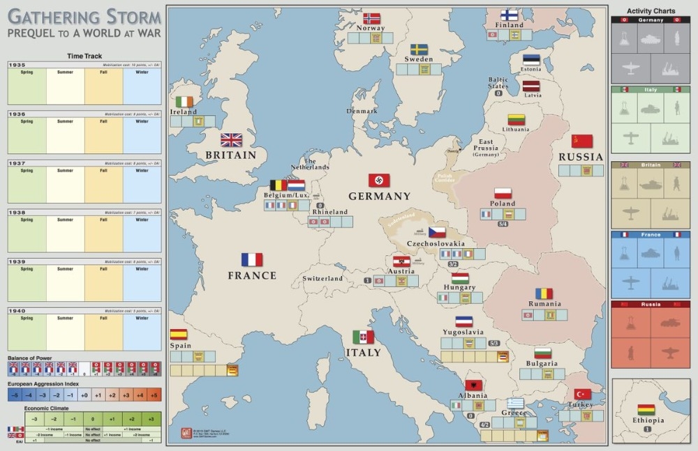 Gathering Storm faz para A World at War da GMT o que Days of Decision fez para World in Flames da ADG. Ele permite aos jogadores simular as manobras diplomáticas, econômicas e políticas que precederam a Segunda Guerra Mundial, como um jogo autônomo ou como uma expansão para A World at War. (Ao contrário de Days of Decision, Gathering Storm abrange apenas os eventos europeus que conduzem a guerra.)