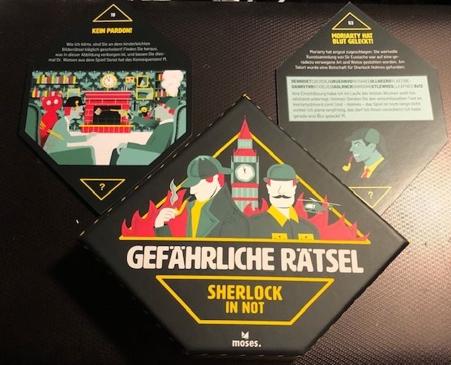 O famoso mestre detetive Sherlock Holmes está em perigo! Seu oponente, o professor Moriarty, preparou 55 testes diabólicos para ele - caso Holmes falhe, nada menos que sua vida está em jogo. Esta caixa de quebra-cabeça fará todos os fãs de Sherlock suarem.