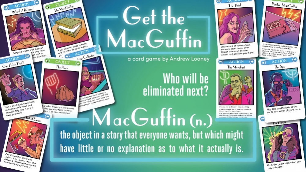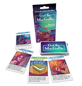 O jogo Get the MacGuffin é um jogo de dedução rápido e divertido envolvendo gerenciamento de mãos e eliminação de jogadores. O objetivo é ser o último jogador com cartas. O jogador com a carta MacGuffin frequentemente ganhará o jogo, mas segurar a carta pode ser bem difícil! Além disso, como há 23 cartas no baralho e os jogadores recebem sempre um número igual de cartas, sempre haverá algumas cartas que não estão em jogo. Descobrir quais cartas estão faltando faz parte da estratégia!