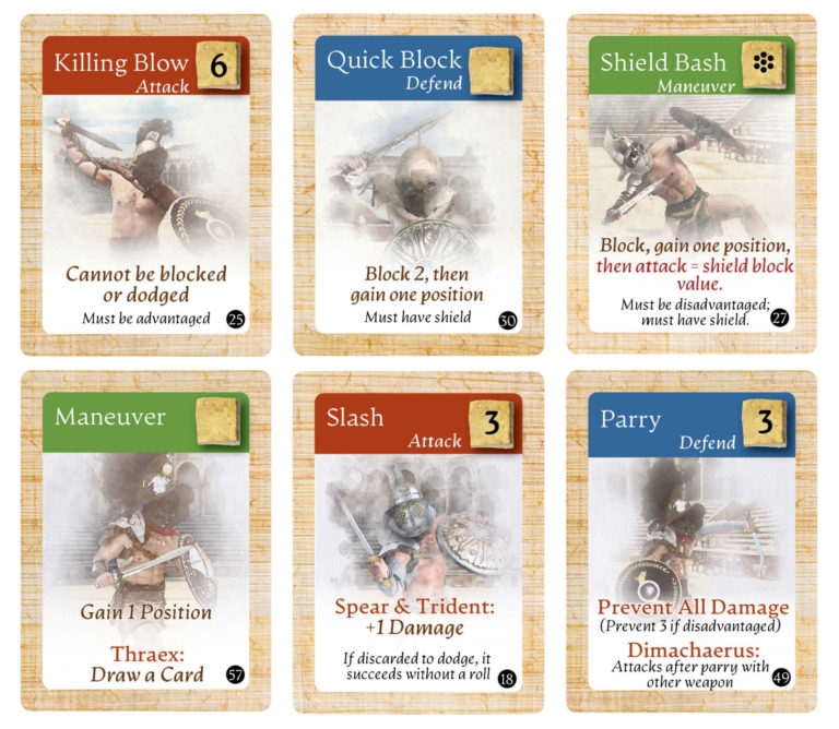 A jogabilidade se move rapidamente, com partidas na arena envolvendo combates de vai e vem com um baralho de cartas. No entanto, a luta tática na Arena é apenas um aspecto do jogo, pois os jogadores também treinarão, comprarão suprimentos, gladiadores e armas, e planejarão jogos futuros. Além disso, os jogadores podem apostar denários (dinheiro romano) em partidas na tentativa de aumentar seus fundos disponíveis. Regras opcionais incluem lutar contra feras selvagens, como tigres e chitas.