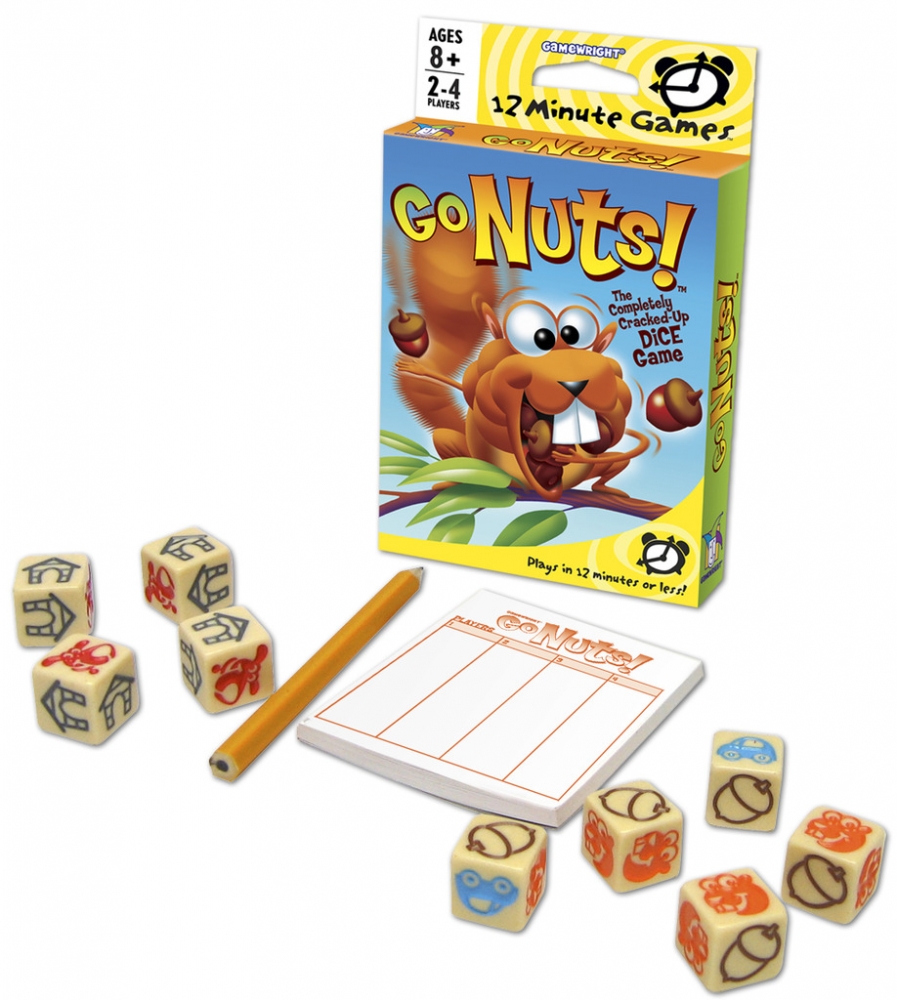 Em Go Nuts! os jogadores querem empilhar o máximo de pontos de bolotas o mais rápido possível. Uma vez por turno o jogador da vez rola 5 dados de "esquilo". Qualquer dado que mostrar um lado de carro é deixado de lado, enquanto aqueles que tiverem o resultado de bolota valem 1 ponto cada. A cada rolagem o jogador pode decidir continuar ou parar e contabilizar os pontos.
