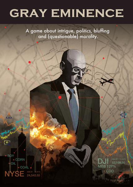 Gray Eminence é um jogo de 3-5 jogadores com duração de 60-90 minutos, no qual os jogadores assumem os papéis de poderosos fantoches do mundo moderno, cada um trabalhando para objetivos comuns, bem como seus próprios e secretos objetivos