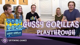 Em Gussy Gorillas, os jogadores começam com um baralho pessoal de cartas viradas para baixo. Sem olhar para a(s) carta(s) em sua mão, os jogadores trocam ou mantêm sua mão simultaneamente, uma ou duas cartas de cada vez, para formar uma coleção pessoal. Depois que todas as cartas forem trocadas ou mantidas, os jogadores contabilizam suas coleções e a pontuação mais alta vence - mas os pares podem se cancelar e as cartas especiais nem sempre são úteis, então negocie com cuidado!