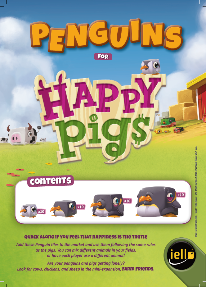 Adicione esses tiles de pinguins ao jogo base Happy Pigs e use as mesmas regras do jogo base. Você pode misturar diferentes animais nos seus campos ou cada jogador usa um animal diferente.